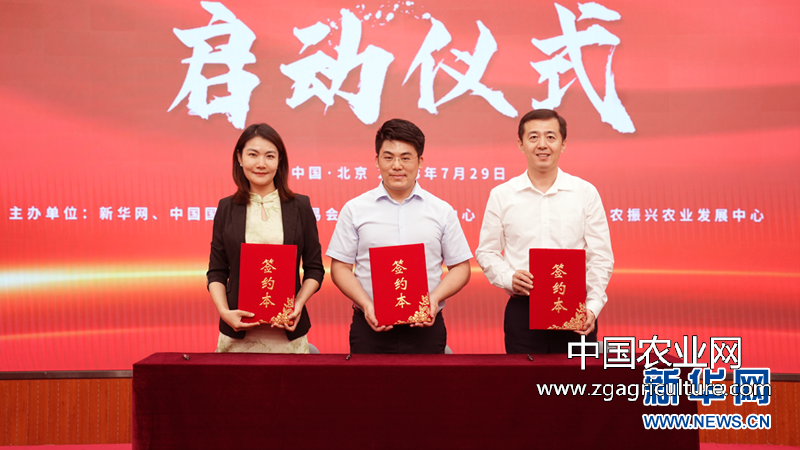 新华网乡村振兴事业部总经理李巍、中农振兴农业发展中心主任王信亮、中国电信集团农业农村事业部副总裁赵宇代表三方签订“全国党建引领乡村振兴优秀成果展”项目合作协议。