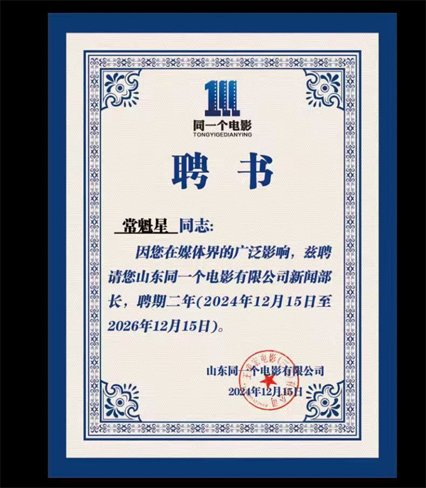 祝贺《常魁星任山东同一个电影有限公司新闻部长》