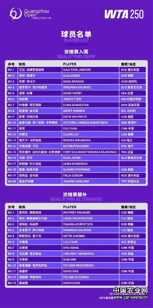 中国农业网广东讯(记者 张兆伟 陆丽萍)2025年广州国际女子网球公开赛资格赛阵容新鲜出炉,中国金花袁悦、前美网女单冠军斯蒂文斯、三届大满贯八强选手汤姆贾诺维奇等众多名将在列。去年温网八强孙璐璐、2023年广网冠军王曦雨,以及韦思佳、高馨妤、郭涵煜等多位中国金花出现在替补名单中。本届比赛将于10月19-26日连续第三...[详细]